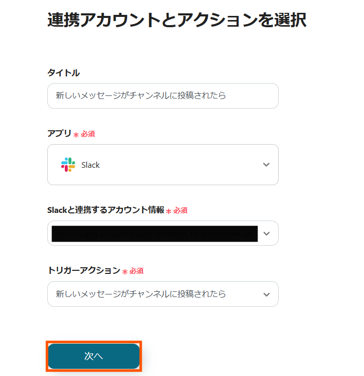 1) アクションは「新しいメッセージがチャンネルに投稿されたら」を選択して、「次へ」をクリックします。