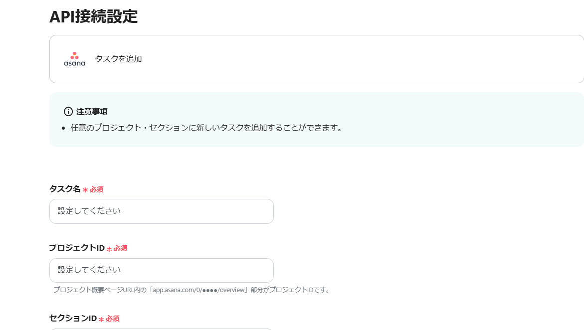 このワークフローを活用すれば、Asanaの特定のプロジェクトに新しいタスクが追加されると、自動でNotionのデータベースに情報が連携されるため、タスク管理と情報集約の連携をスムーズにし、業務の効率化に貢献します。