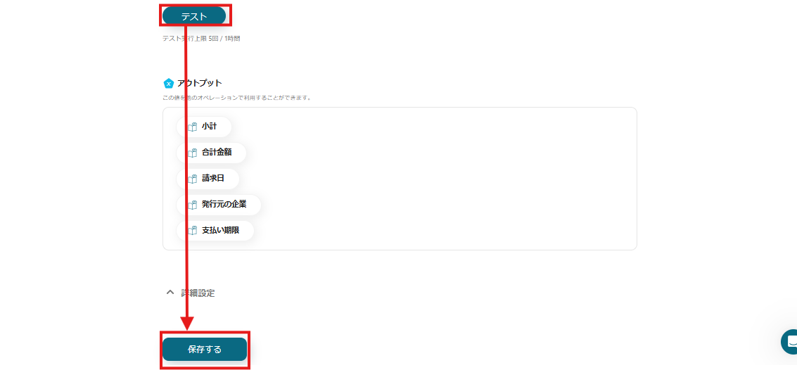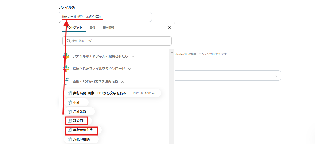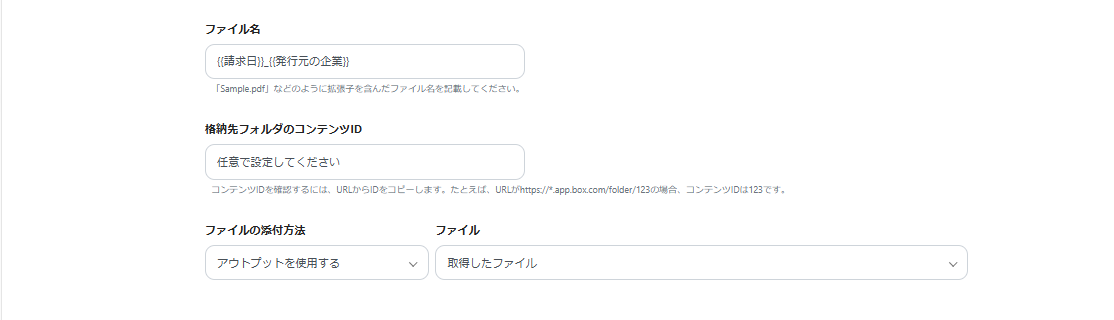 このように設定すると、請求書データから「請求日」と「発行元の企業」を取得し、Boxのファイル名に自動で引用できます。