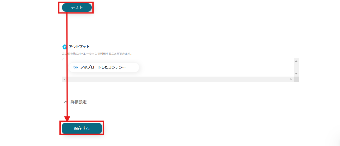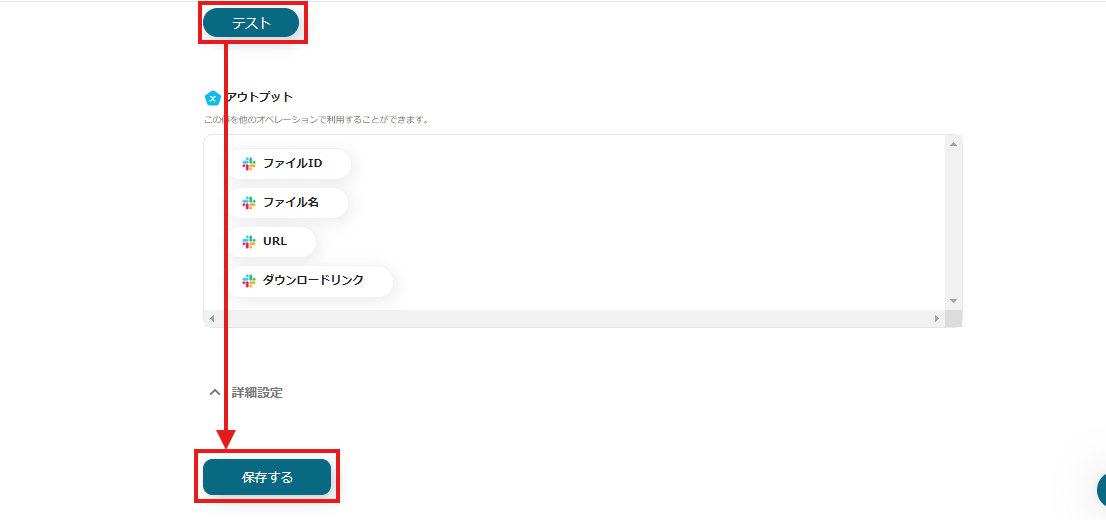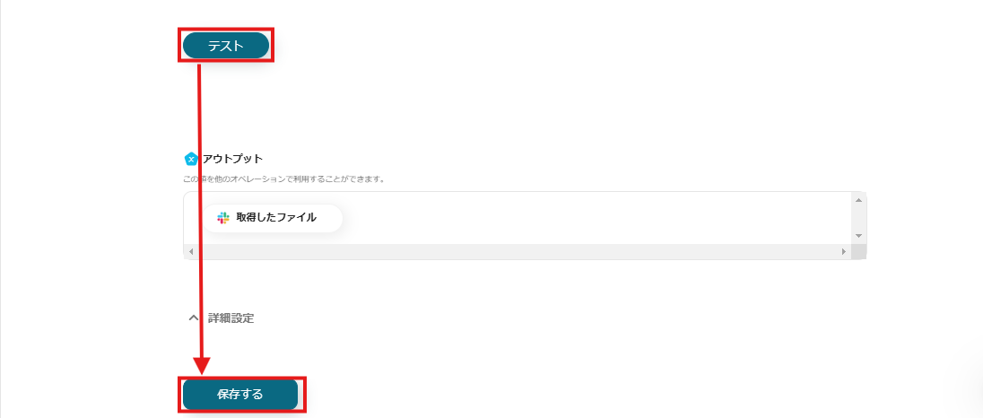 ファイルの保存方法は「アウトプットを取得する」を選択し、ファイルは「取得したファイル」を選択しましょう。