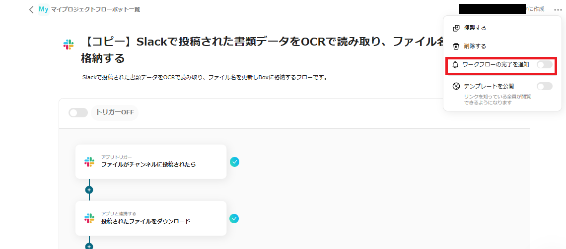 2.Slackで投稿された書類データをOCRで読み取り、ファイル名を更新しBoxに自動で格納できるフローです。