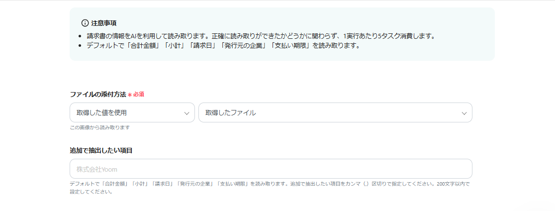 例えば、請求書を読み取りたい場合は、アクションは「請求書を読み取る」を選択しましょう。