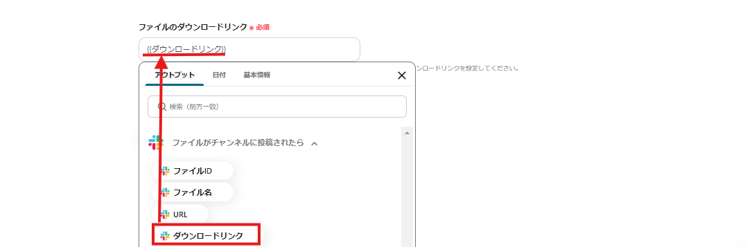 このように設定することで、Slackのダウンロードリンクを自動で引用できます。