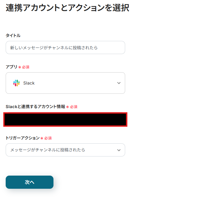 連携アカウントとアクションを選択する画面が表示されるので、今回連携するSlackのアカウントを確認し「次へ」をクリックします。