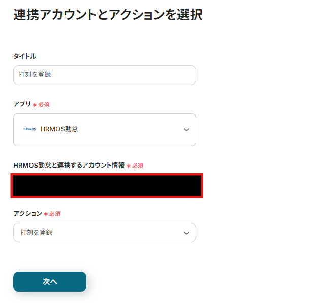 連携アカウントとアクションを選択する画面が表示されるので、今回連携するHRMOS勤怠のアカウントを確認し「次へ」をクリックします。