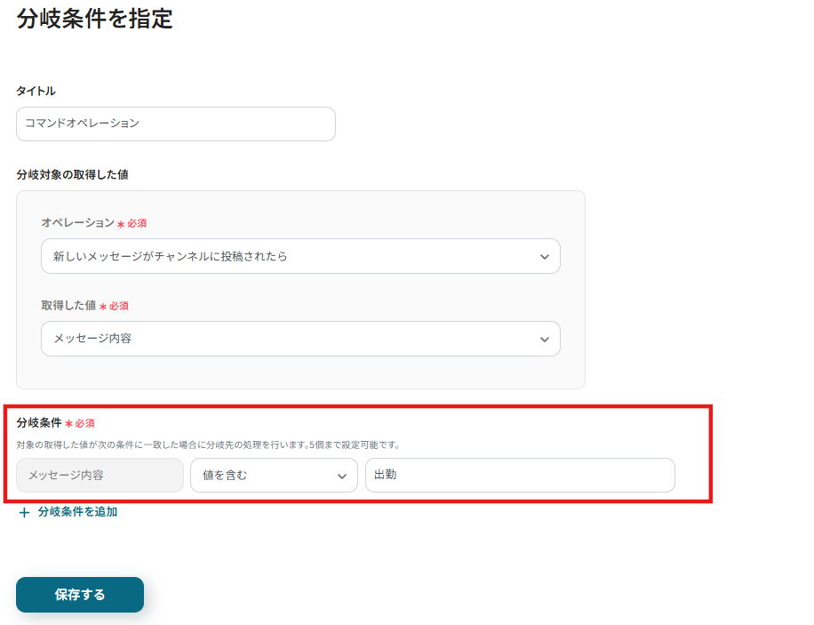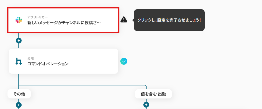 Slackに送信されたメッセージに「出勤」というワードが含まれていた場合に、HRMOS勤怠へ続くフローヘ進むように設定を行います。