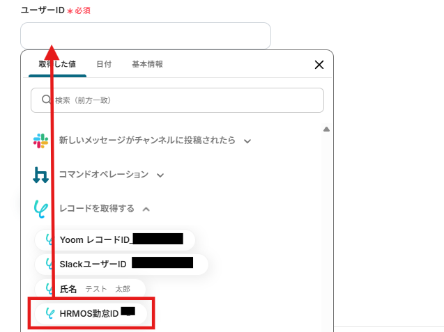 ユーザーIDにはYoomのデータベースから取得したHRMOS勤怠のIDを選択しましょう。