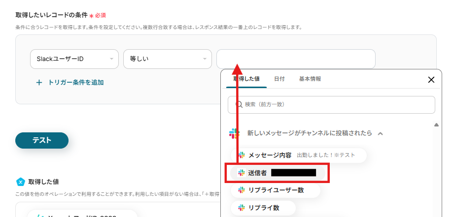 今回は画像のように「データベースに保存されているSlackユーザーIDとメッセージ送信者のIDが等しい」という条件を設定しました。