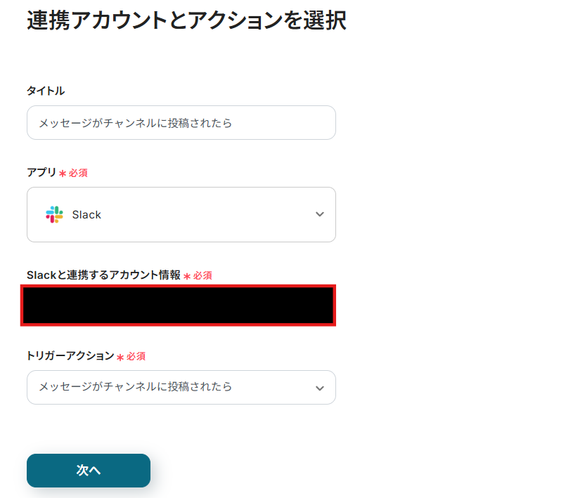 - 次に、トリガーでSlackを選択し、「メッセージがチャンネルに投稿されたら」というアクションを設定し、対象のチャンネルを指定します。
