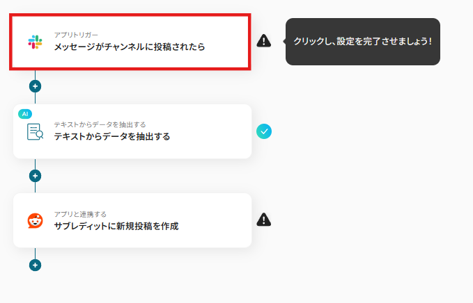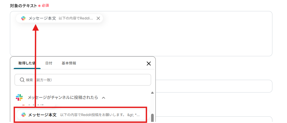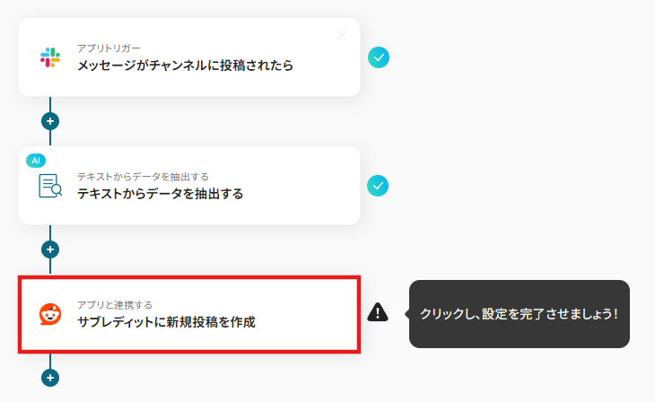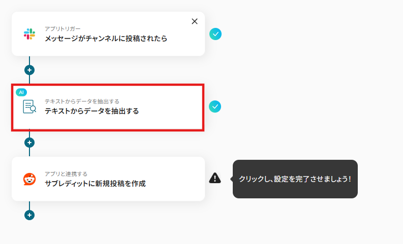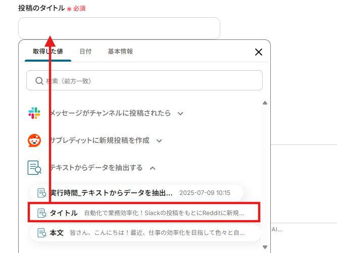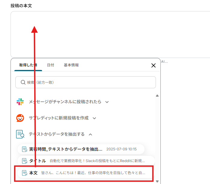 - AI機能のテキスト抽出オペレーションでは、Slackの投稿本文から、Reddit投稿のタイトルや本文として利用したい部分をどのように抽出するかを任意で設定してください。