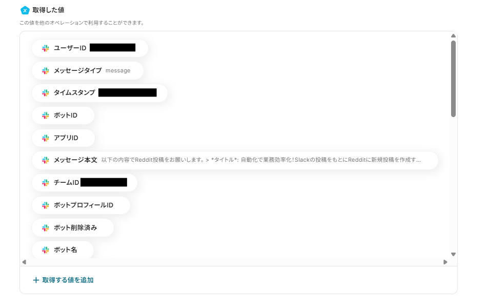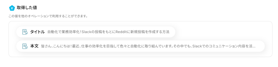 - Redditへ新規投稿を作成するオペレーションでは、投稿先のサブレディットや投稿内容を、Slackから取得した情報や固定のテキストを組み合わせて自由に設定することが可能です。