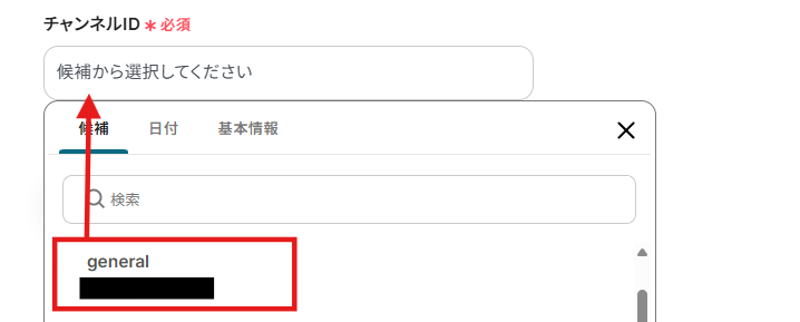 チャンネルIDは以下のように、表示される候補から選択しましょう。