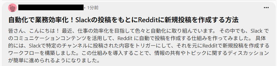 - Slackへの投稿後に自動でRedditへの投稿が完了するため、これまで手作業での転記に費やしていた時間を他の業務に充てることができます。