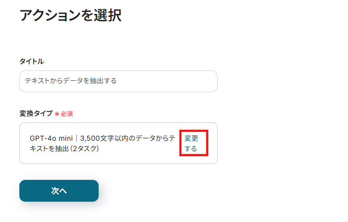 連携アカウントとアクションを選択する画面が表示されるので、今回連携するアカウントを確認し「次へ」をクリックします。