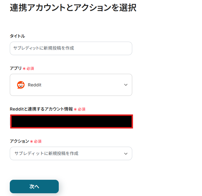 - Redditの投稿アクションでは、投稿先のサブレディット名や投稿のタイトル、本文などを、Tallyの回答内容と紐づけて任意に設定してください。