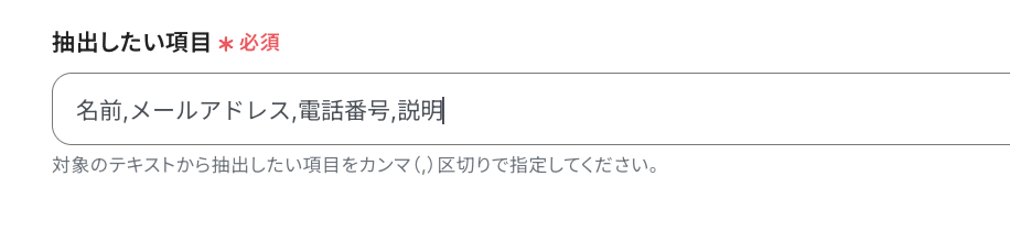 抽出したい項目:Slackに投稿されたメッセージから、抽出したいテキストデータの項目を設定します。「名前」や「メールアドレス」など、抽出したい項目をカンマ(,)区切りで入力してくださいね!