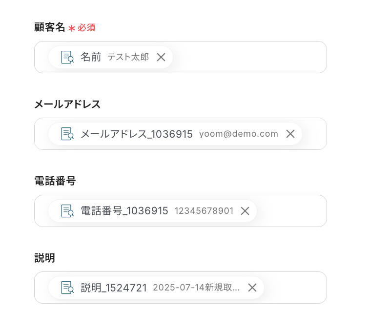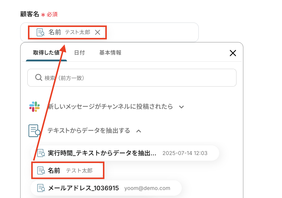 たとえば、「顧客名」には「取得した値」の「テキストからデータを抽出」する内にある「名前」を設定します。