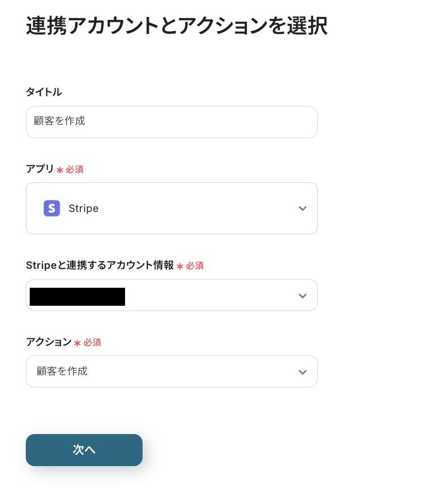 タイトルは必要に応じて変更し、連携するアカウント情報はフローで使用するアカウントであることを確認しましょう。アクションは「顧客を作成」のままにして、「次へ」を押してください。