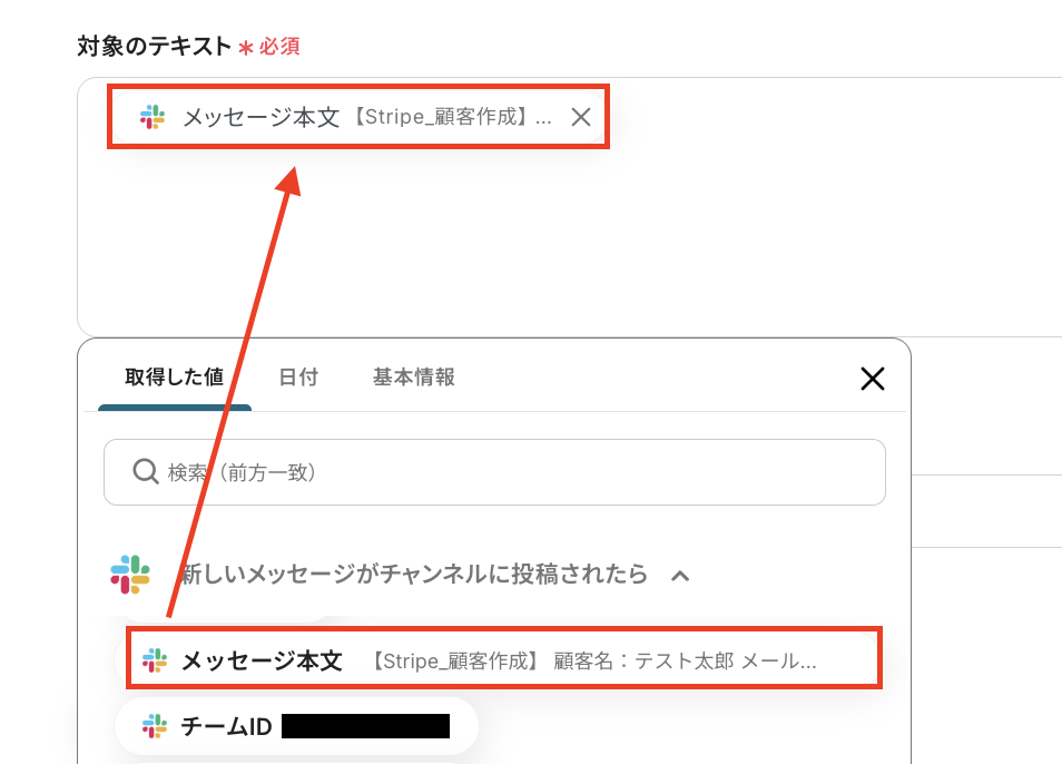 対象のテキスト:テキストデータを抽出する対象となるテキストを、アウトプットを使って設定します。今回はSlackに投稿されたメッセージが対象となるので、下図のように設定してください。