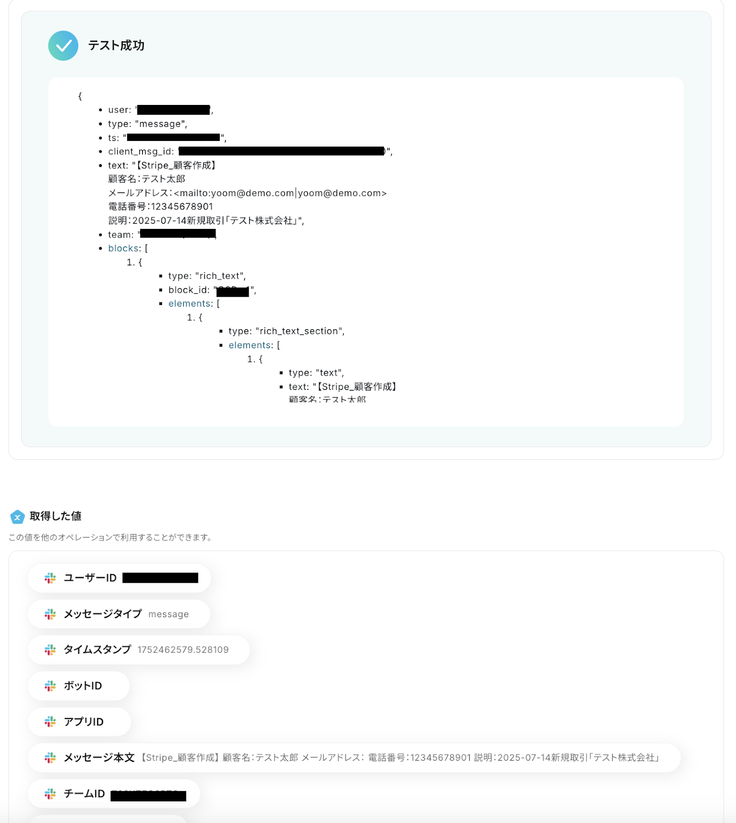 テストが成功すると、先ほどSlackに投稿したメッセージの情報が「取得した値」にアウトプットとして抽出されるので、内容を確認しましょう。