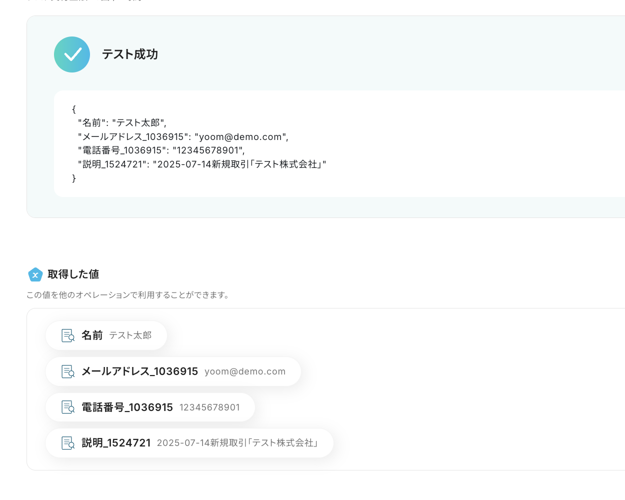 アウトプットとは、トリガーやオペレーション設定時に、「テスト」を実行して取得した値のことを指します。
