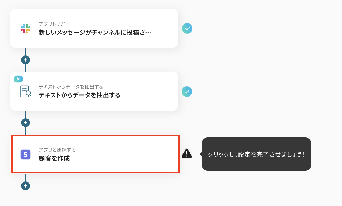 「Slackの投稿内容をもとにStripeで顧客を作成する」フローは、営業活動や顧客対応を効率化する業務ワークフローです。