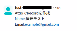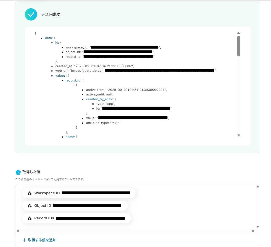 取得した値を後続のオペレーションで活用することで、Slackのメッセージデータから必要な内容をAttioに自動登録可能となります。