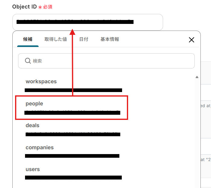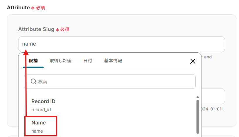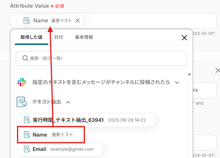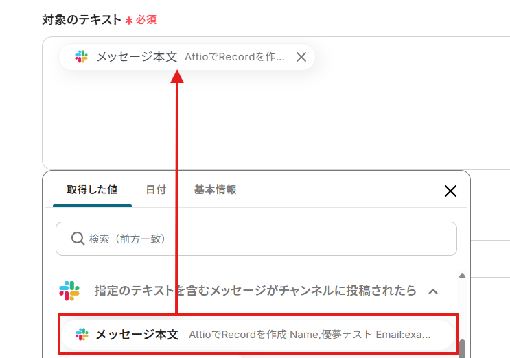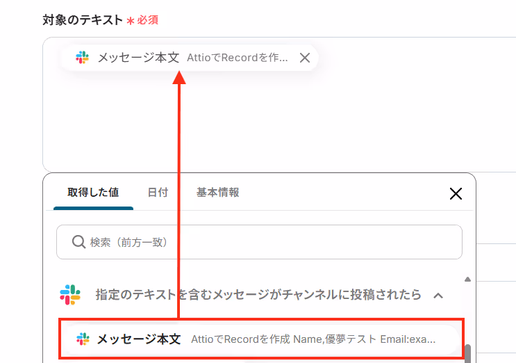 「対象のテキスト」は、入力欄をクリックして表示される取得した値から選択してください。