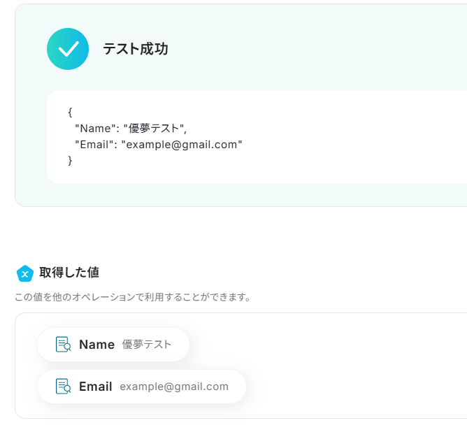 6.入力を終えたら連携テストを行います。テストボタンをクリックしましょう。以下のように「取得した値」にデータが抽出されていることを確認してください。