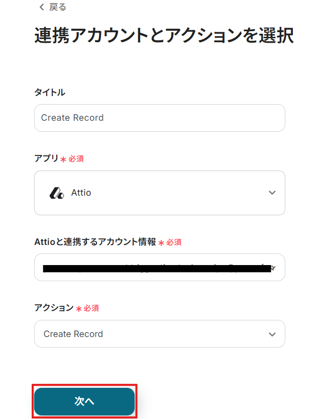 連携するアカウント情報には、ステップ1で連携したアカウント情報が反映されています。トリガーアクションはそのままにして、「次へ」をクリックしてください。