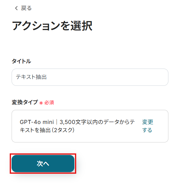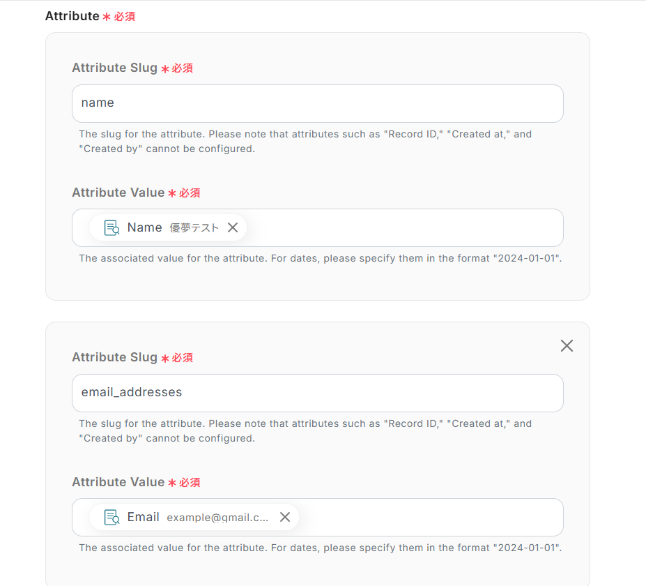 ここで抽出したテキストデータを用いて、Attioにデータを追加するため、Attioに追加したい項目を全て設定するようにしましょう。