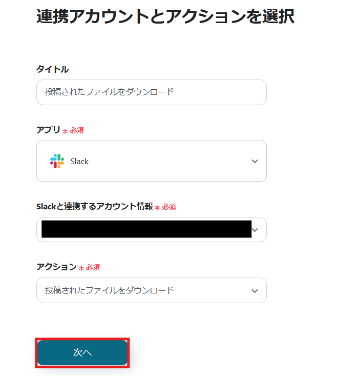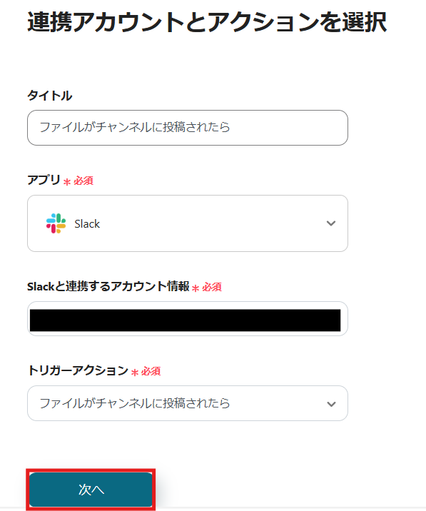 1) アクションは「ファイルがチャンネルに投稿されたら」を選択して、「次へ」をクリックします。