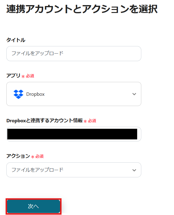 2) アクションは「ファイルをアップロード」を選択し、「次へ」をクリックします。