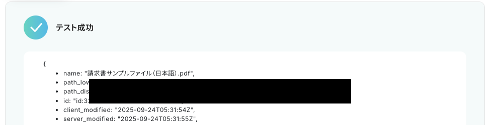 設定後、テストをクリックしてください。すると、以下のように表示されて実際にDropbox側でファイルが格納されました!