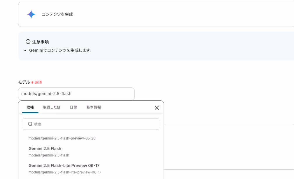 入力バーをクリックすると『候補』に情報が展開されるので、そのなかから運用に沿ったモデルを選択できます。