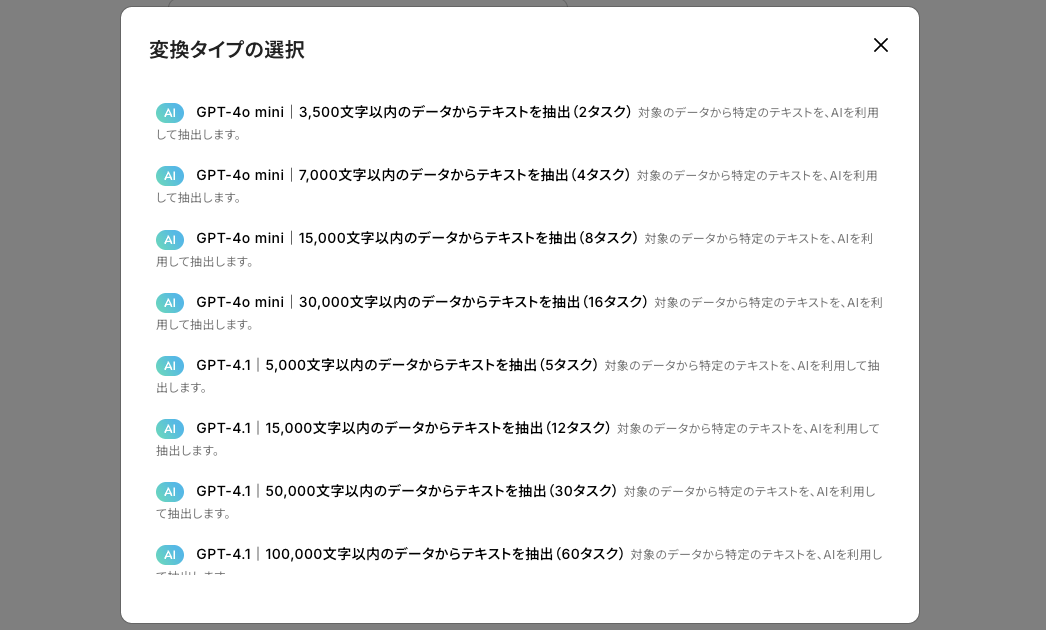 もし、アクションを変更したい場合には、『変更する』を押すとその他の抽出アクションを選択できます。(AIモデルも選択可能)