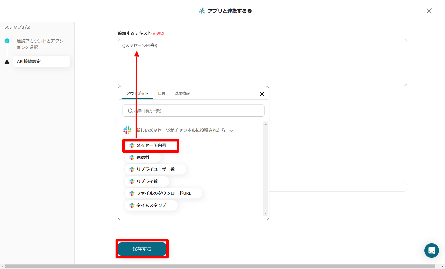 項目内にはSlackのアウトプットが表示されます。今回は、「メッセージ内容」を選択してください。