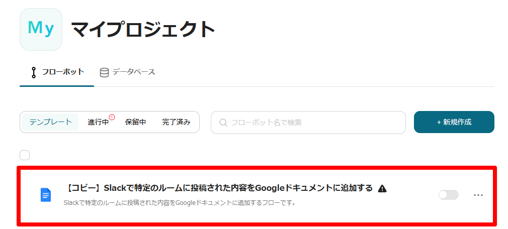 「【コピー】Slackで特定のチャネルに投稿された内容をGoogleドキュメントに追加する」をクリックします。