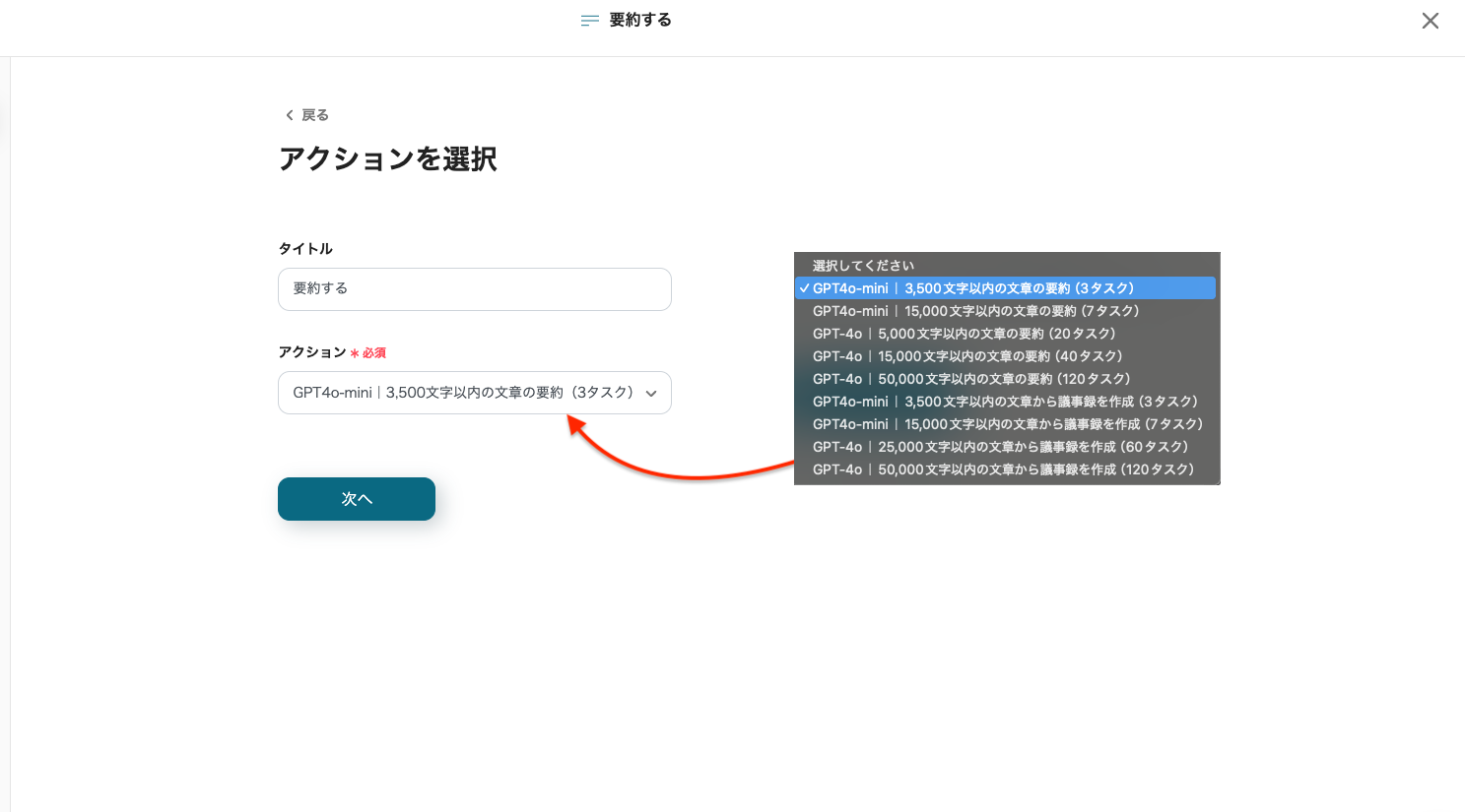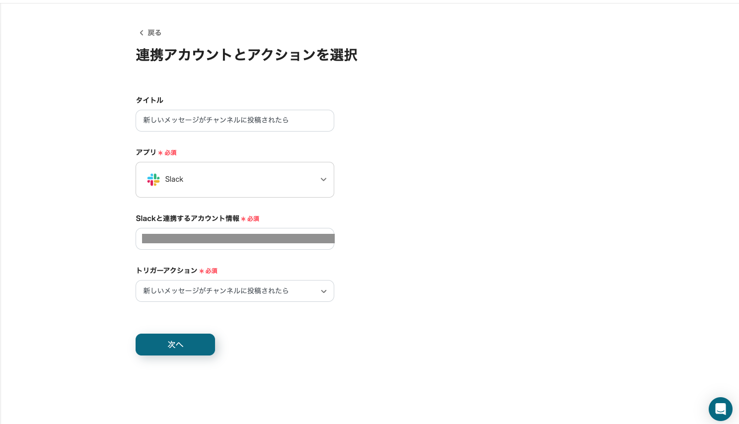 タイトルは編集可能ですが、トリガーアクションは変更せず「次へ」をクリックしてください。