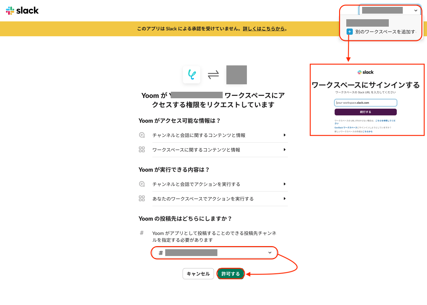 サインイン後、画面下部の「チャンネルを検索」から通知先のチャンネルを選び、「許可する」をクリックすると、Slackのマイアプリ連携が完了します。