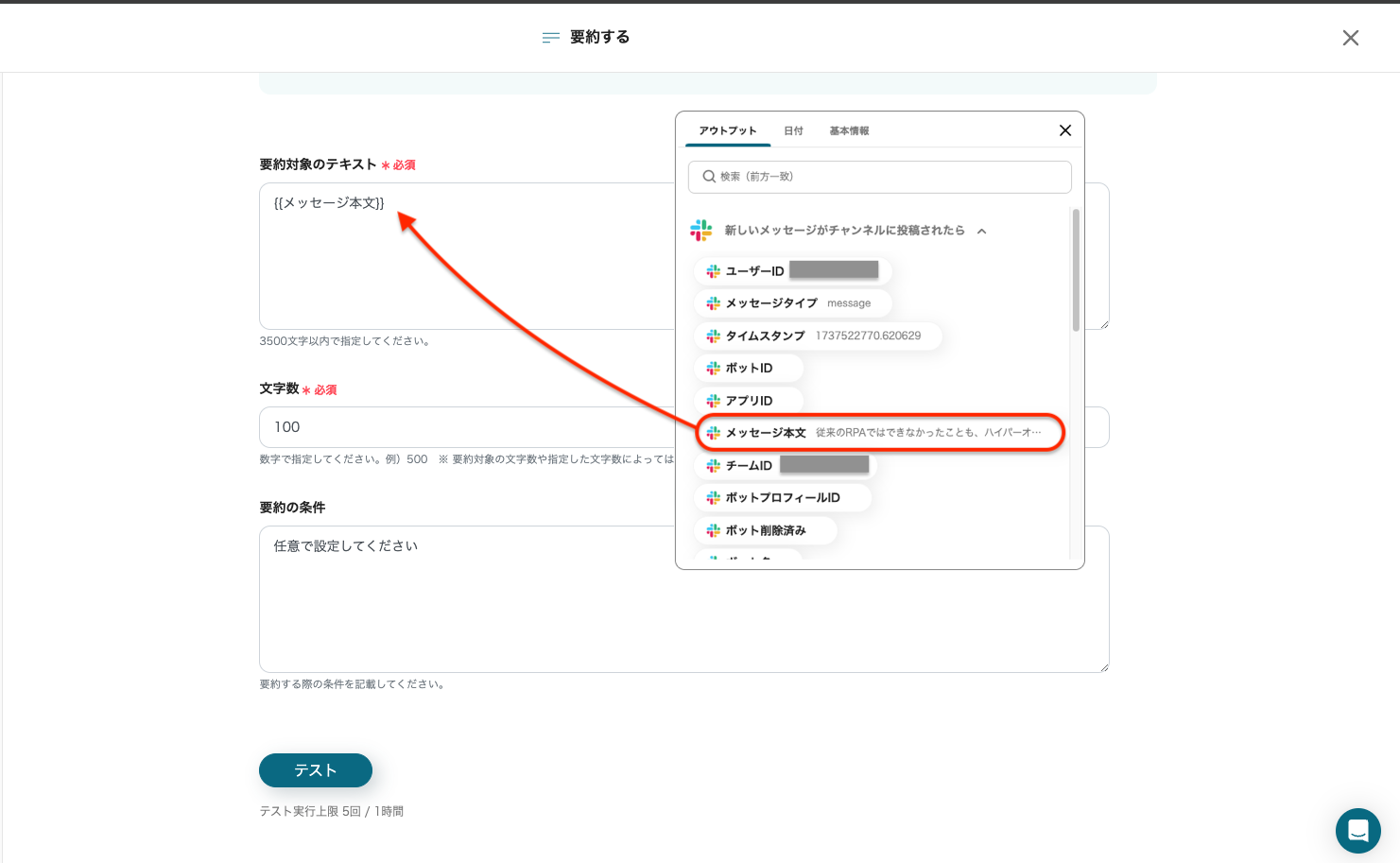 「要約対象のテキスト」では、欄をクリックしSlackのメッセージ本文を選択してください。