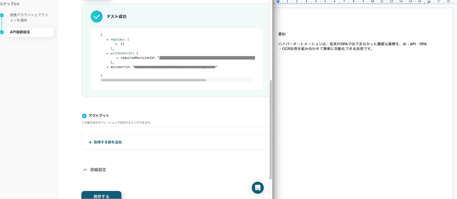 テスト後、Googleドキュメントに要約結果が追加されていることを確認できたら、「保存する」をクリックしてください。