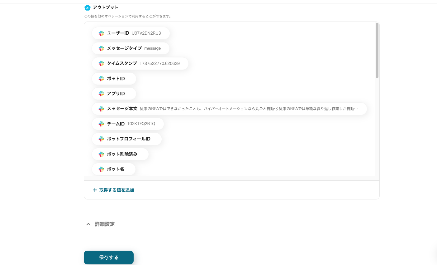 アウトプットにて、チャンネルで投稿されたメッセージ情報が取得できたことを確認し、「保存する」をクリックしてください。