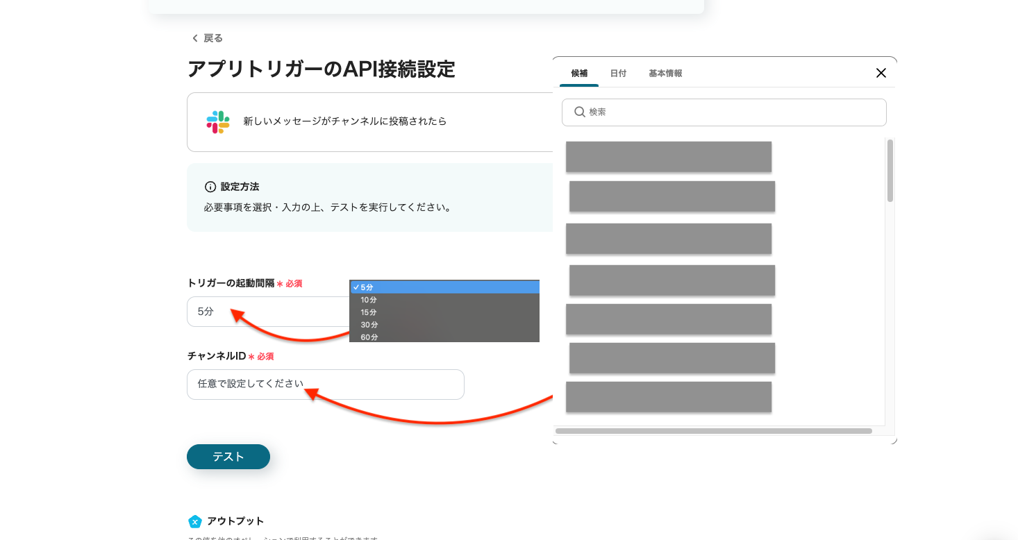「チャンネルID」は、入力欄をクリックし表示された候補からチャンネルを指定してください。