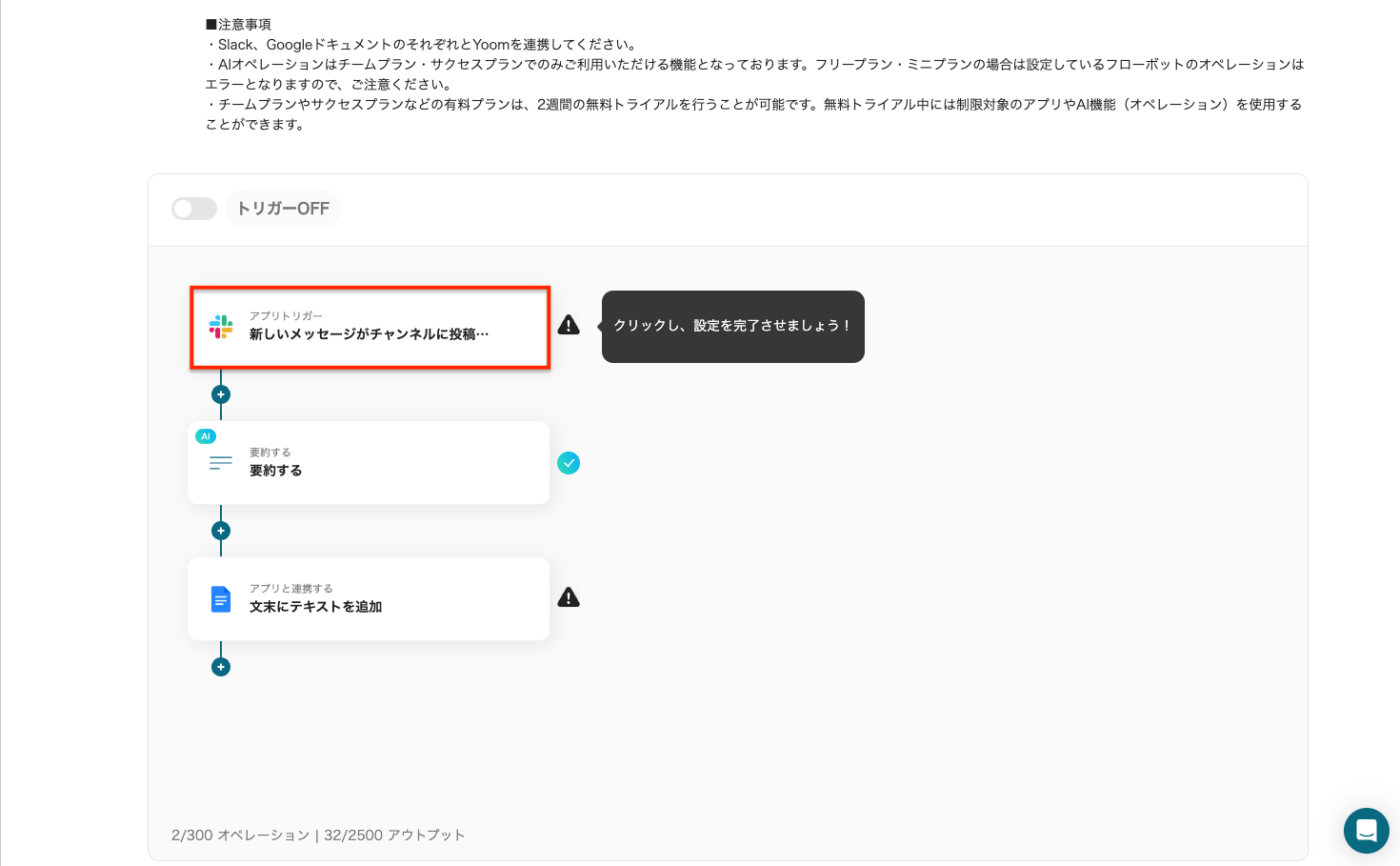その後、メッセージ内容をAIで要約し、Googleドキュメントが提供するAPIを使用して要約結果をGoogleドキュメントに追加することが可能です。これにより自動化が実現できます。