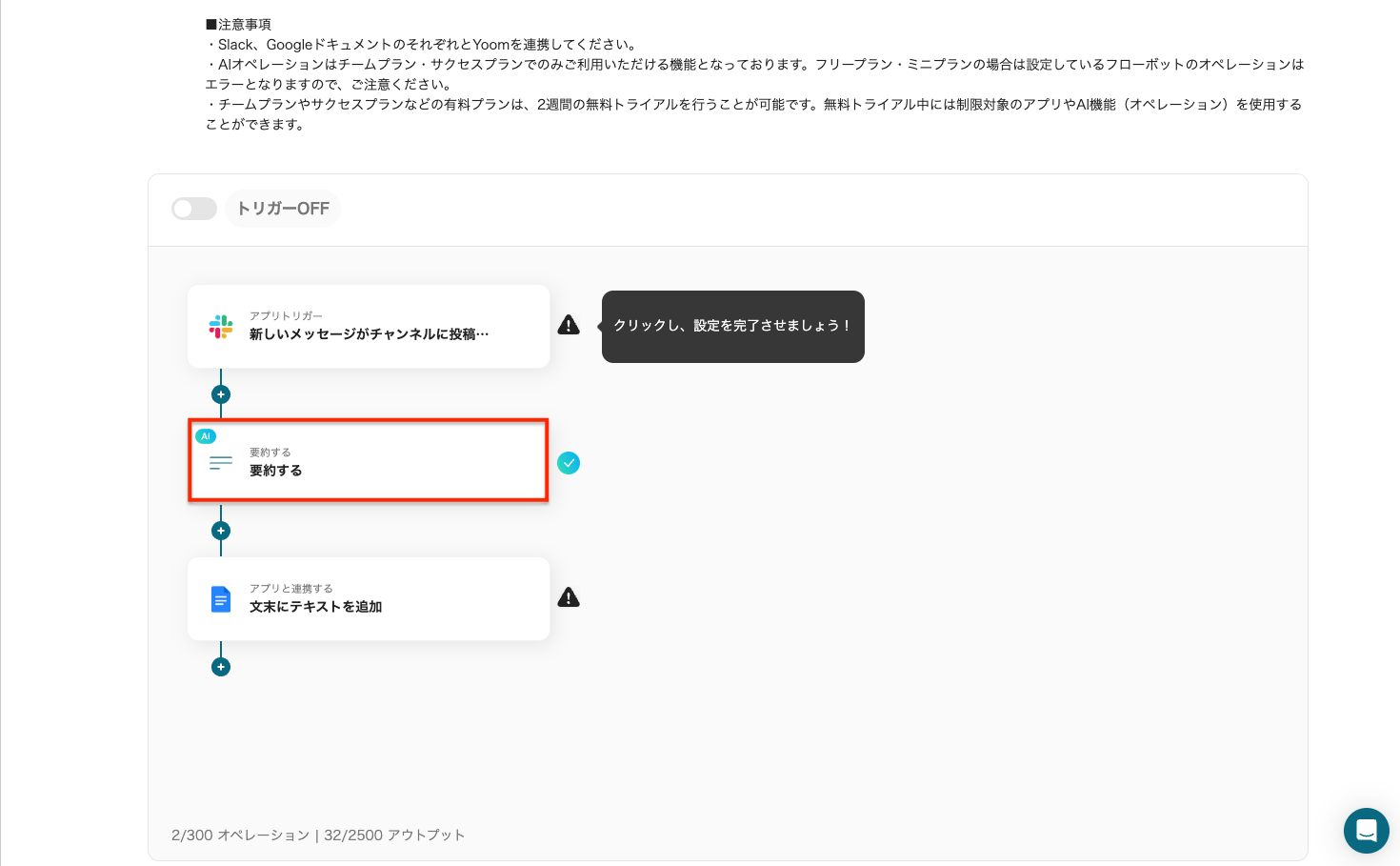 ※AIオペレーションはチームプラン・サクセスプランでのみご利用いただける機能となっております。フリープラン・ミニプランの場合は設定しているフローボットのオペレーションはエラーとなりますので、ご注意ください。
