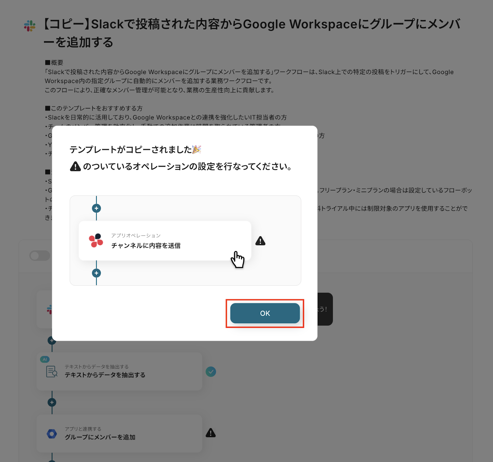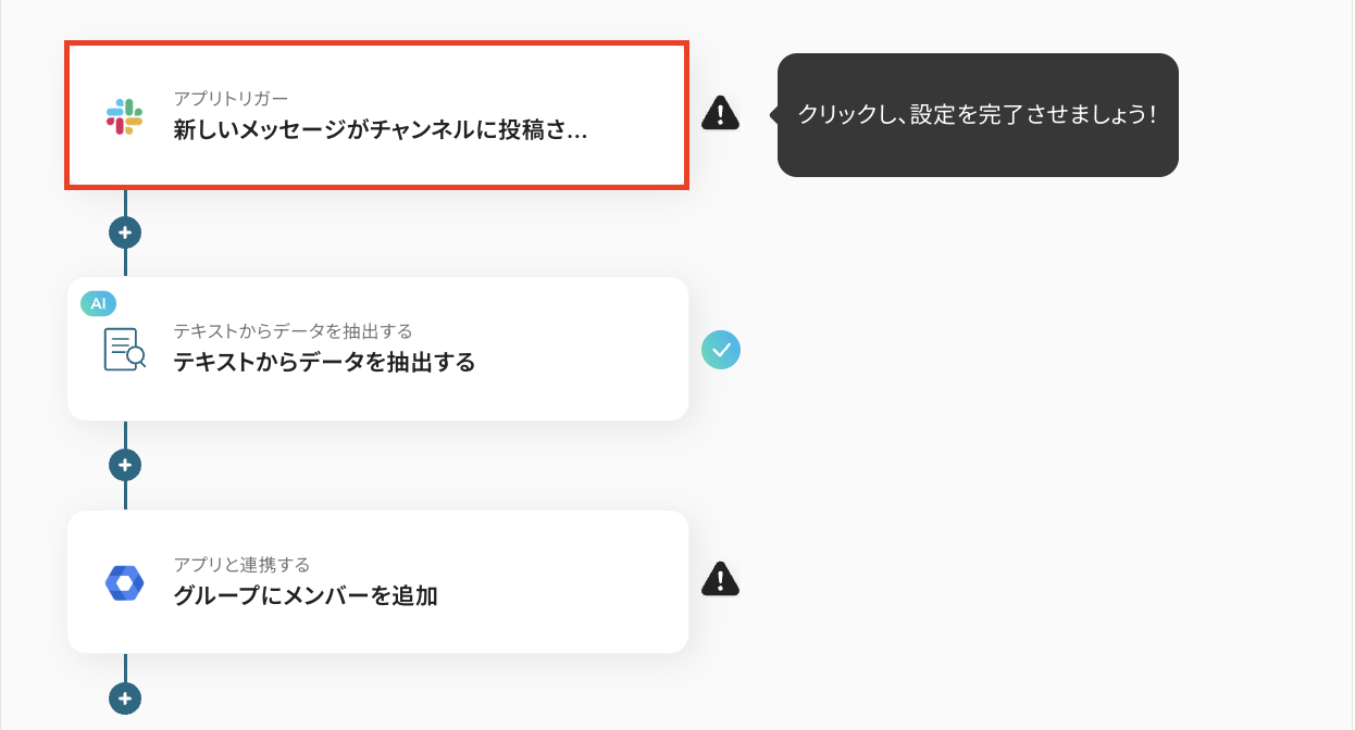 Slackに新しいメッセージがチャンネルに投稿された際に、AIがデータを抽出し、Google Workspaceのグループにメンバーを自動追加するフローです。