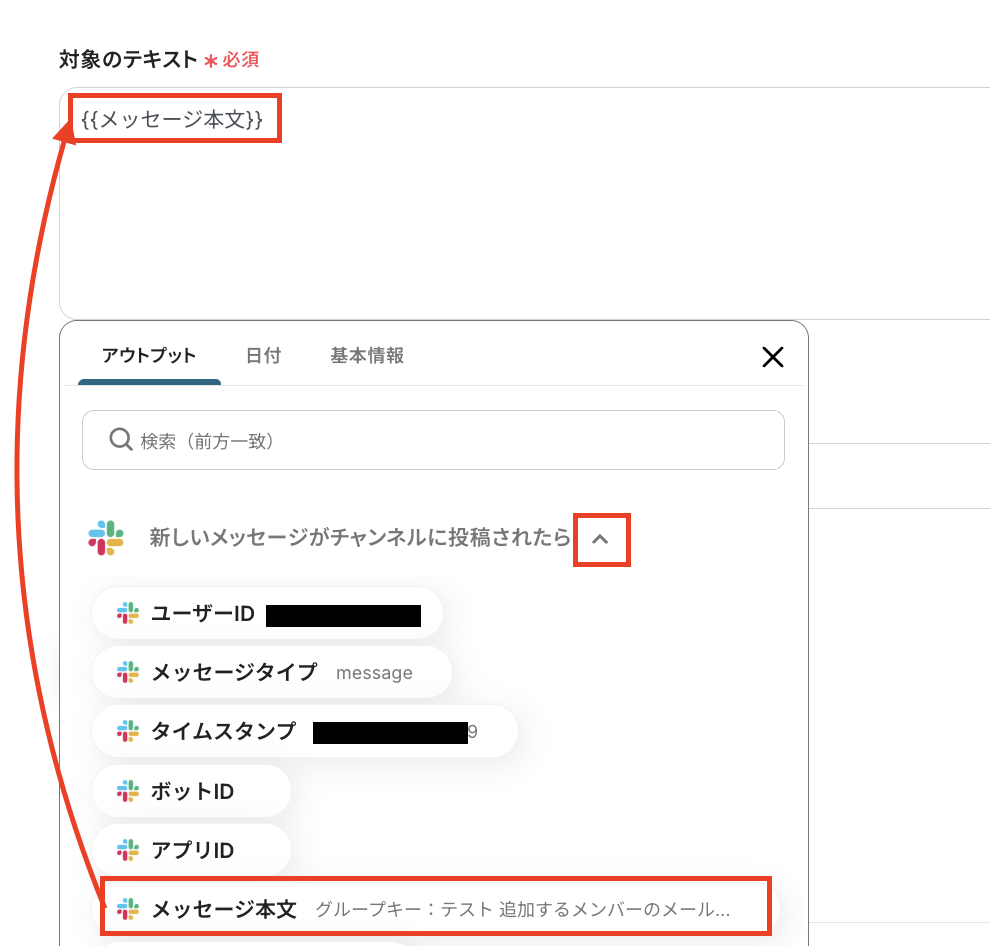 今回はSlackに投稿されたメッセージからテキストを抽出するため、トリガー設定で取得したアウトプットを引用して設定しましょう。