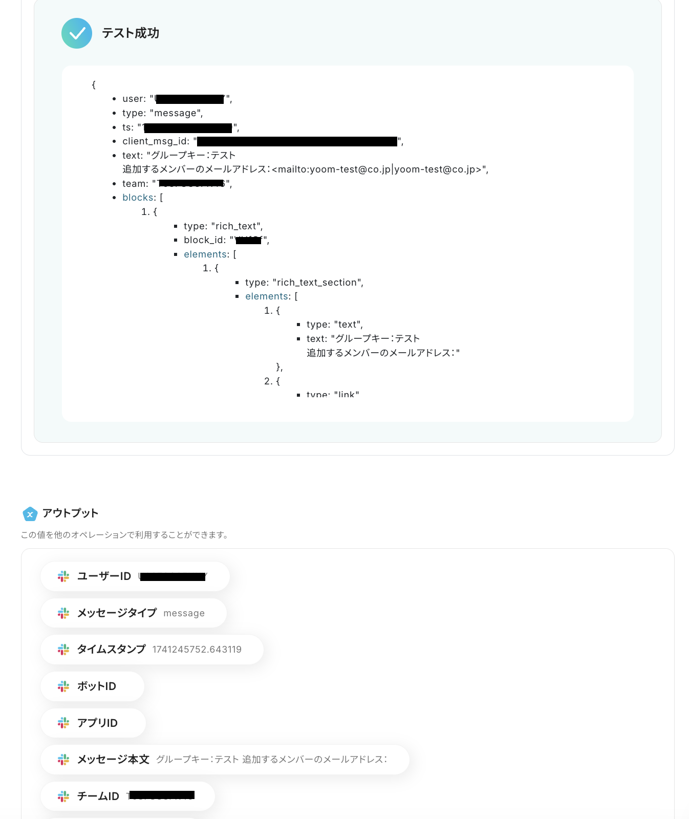 アウトプット(取得した値)とは、トリガーやオペレーション設定時に、「テスト」を実行して取得した値のことを指します。