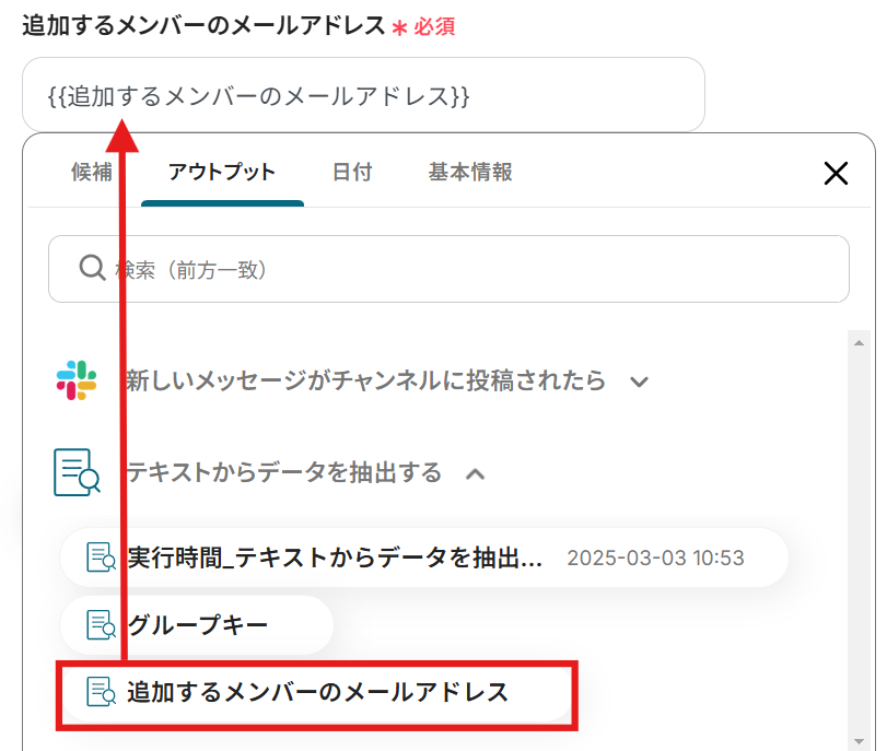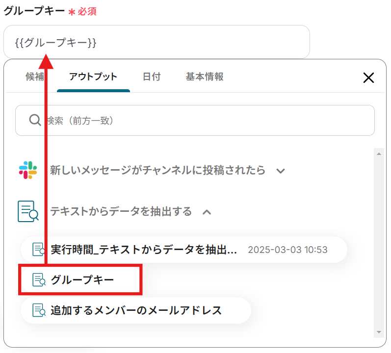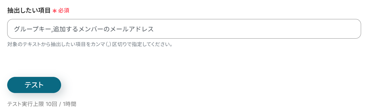 今回は、グループキーと追加するメンバーのメールアドレスを抽出するので、以下のように設定しました。